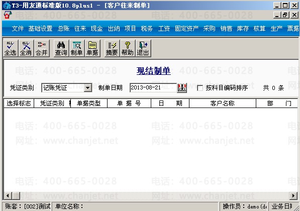 (2)到核算模块制单,点击“客户往来制单”选择“现结制单”后点击“确定”,可见没有该单据记录:
