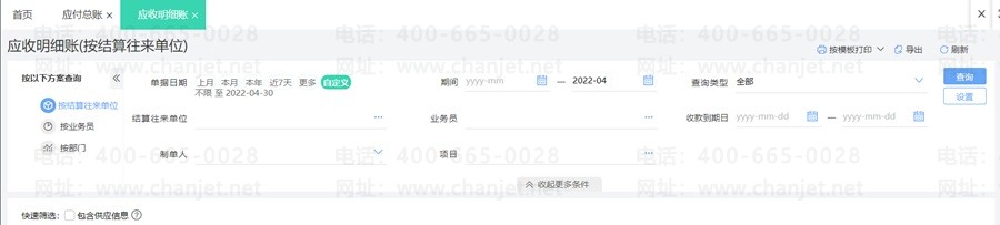账表查询,可以按日期、应收类型、结算往来单位、收款到期日期等条件筛选;