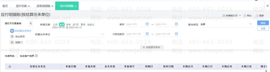 账表查询,可以按日期、应付类型、结算往来单位、付款到期日期等条件筛选;
