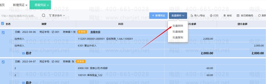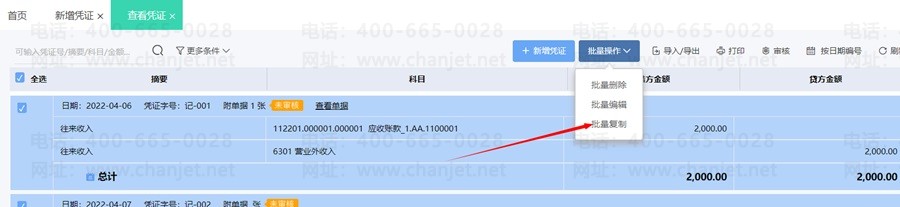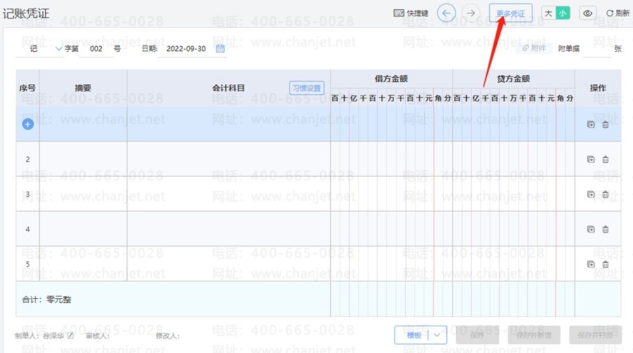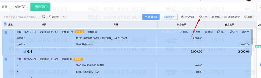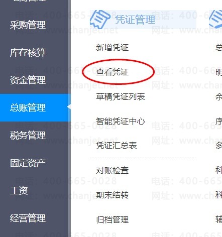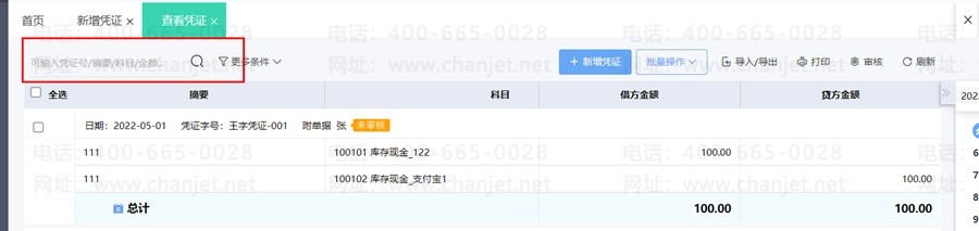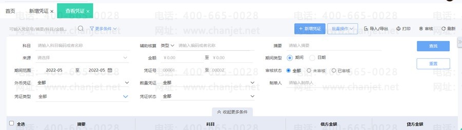 操作:总账管理-凭证管理-查看凭证,或在新增凭证界面点击“更多凭证”按钮,都可以打开凭证列表界面。