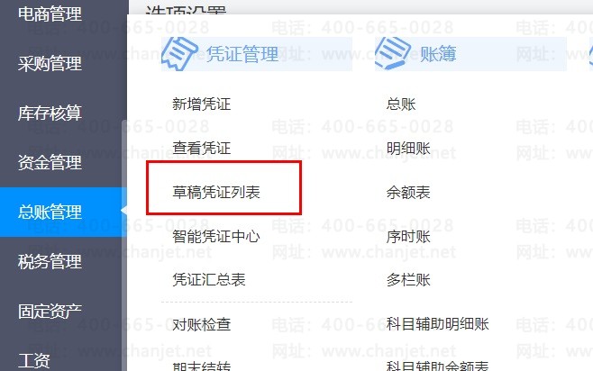 操作:总账管理-凭证管理-草稿凭证列表。