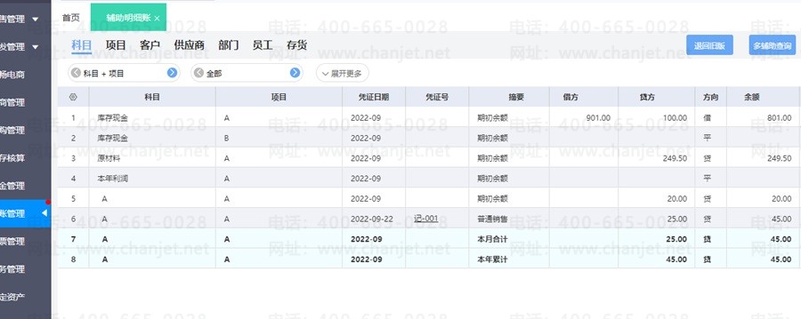 • 辅助核算档案,支持显示其涉及的全部科目,或某一个科目的明细账数据。