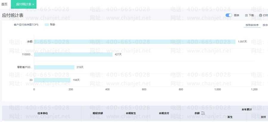 ①应付统计表表格中数据包含截止目前对应应付账款余额≤0 的数据,但是客户应付排序图中不显示该客户数据。
