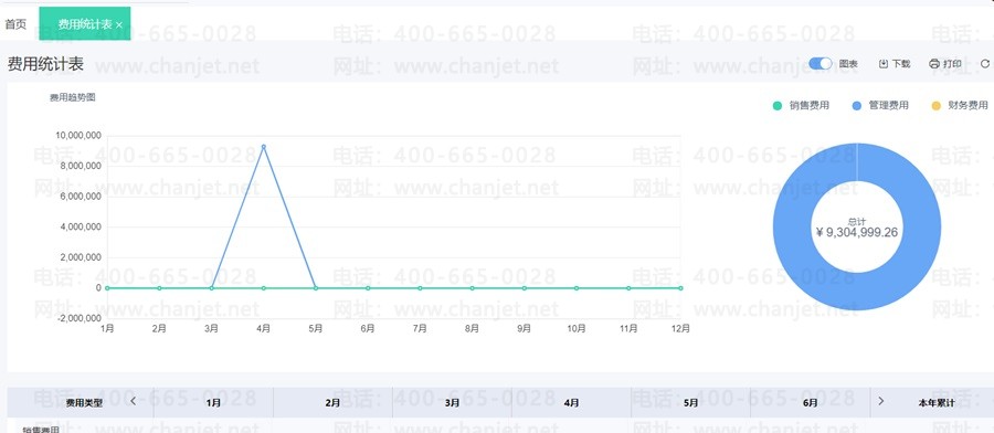 ①费用统计表反应统计的是企业期间费用数据(包括销售费用、管理费用和财务费用)