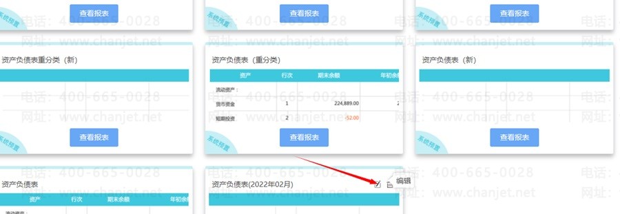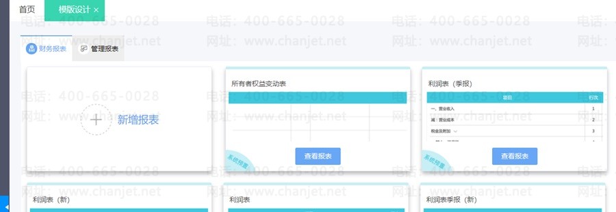 进入【模版设计】后,会看到系统预置的报表格式,系统预置的报表不允许删除和修改,只能进行报表数据的查看,点击“查看报表”即可。
