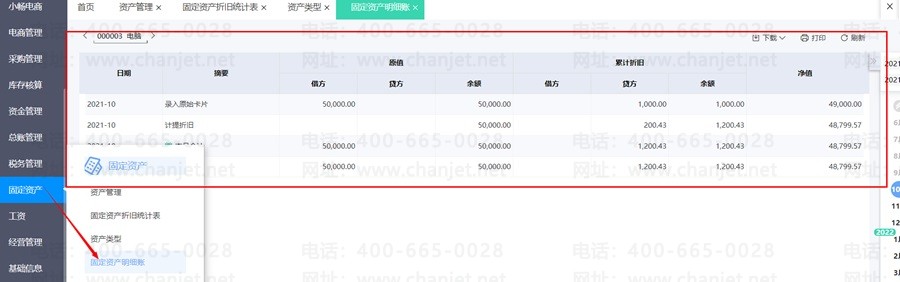 右上角可下载该项固定资产数据,点击批量下载可下载全部固定资产的数据,打印可打印当前界面的数据