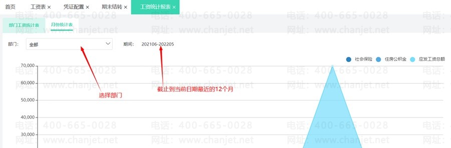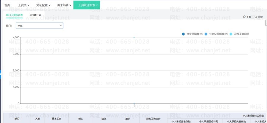 在工资统计报表页面,可以筛选部门,查看对应期间的薪酬数据,包括条形图和折线图两种格式