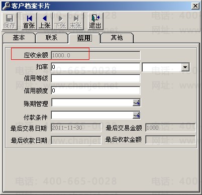 2、在基础档案的客户档案上方的菜单栏中点击“信用”按钮进行计算,系统会自动维护并提示相关信用数据计算完毕。 点击“基础设置”—“往来单位”—“客户档案”,点击“信用”按键,提示“最后收款日期添加成功”,再查看北京公司档案卡片中,应收余额系统统计为1000元。