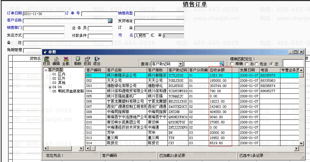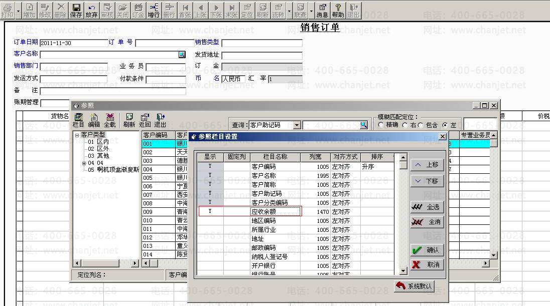 a、增加订单,选择客户界面,点击左上角“栏目”,找到“应收余额”并在显示列打上“Y”,点击“上移”将“应收余额”移至客户分类编码后,方便查看。