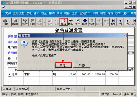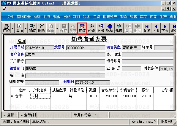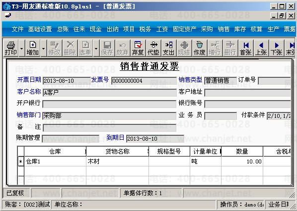 (1)销售给客户A木材10吨,在销售模块界面,先增加一张销售发票, 点击“增加”-“普通发票”,输入木材10吨后保存。