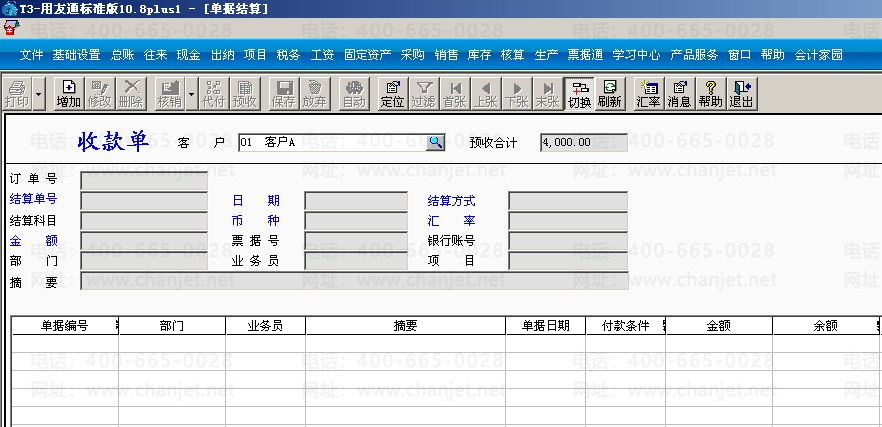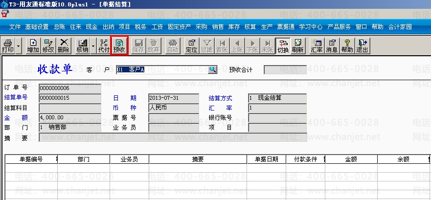 (2)打开销售管理模块,点击“收款结算”—选择客户:客户A—“增加”—输入金额和结算方式