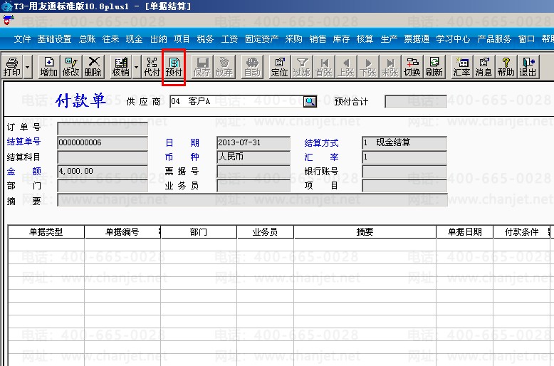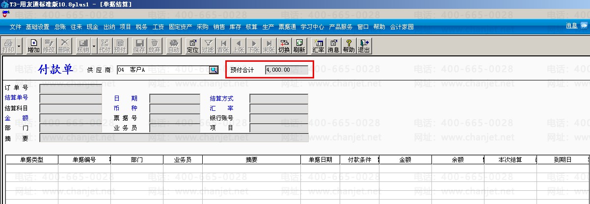 (1)打开采购管理模块,点击付款结算,供应商选择客户A,点击“增加”输入金额和结算方式,保存之后再点击“预付”。