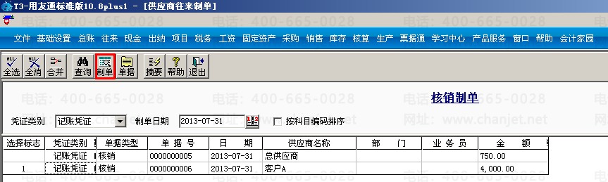 (4)对预付款进行制单,打开核算模块,点击“供应商往来制单”—选择“核销制单”