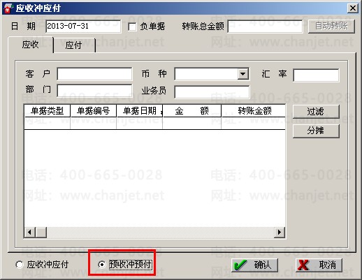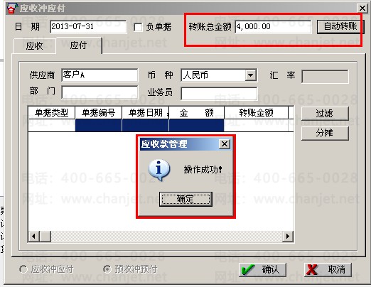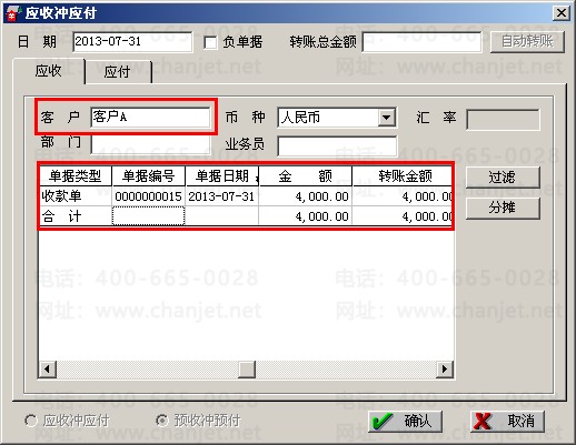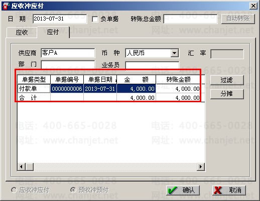 (3)将预收款冲掉预付款,点击“客户往来”—“应收冲应付”—选择“预收冲预付”,在应收页签,客户选择:客户A,点击“过滤”,在应付页签供应商选择:客户A,点击“过滤”