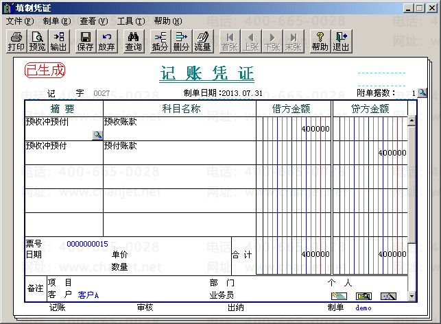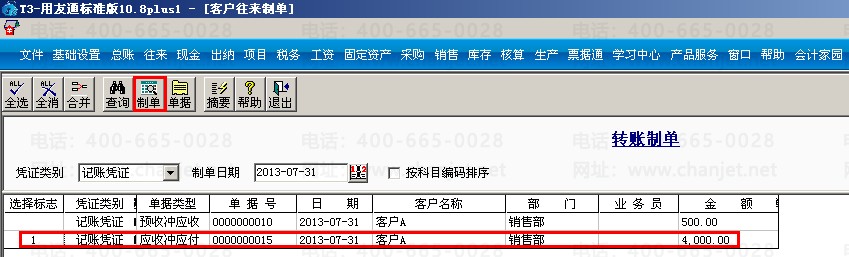 (6)对预收冲预付业务进行制单,点击“客户往来制单”—选择“转账制单”