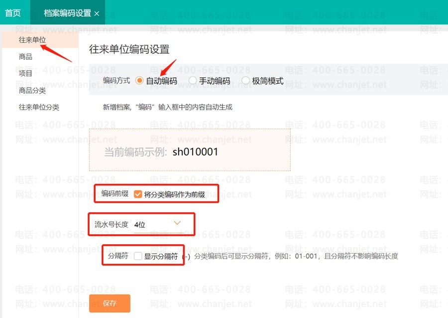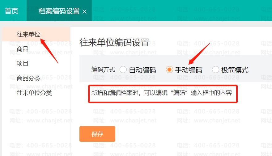 ①单位编码:目前有3种方式,分别是自动编码、手动编码和极简模式。(注:自动编码方式下,删除的往来单位编码也会占用编码)