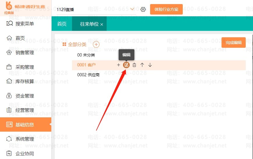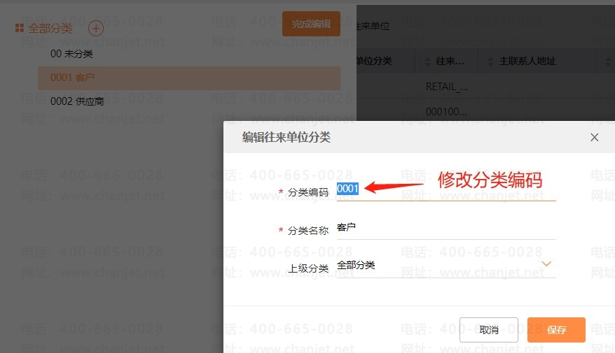 系统默认的分类编码规则为自动编码,自动编码规则下是不能修改分类编码的,需要进入【系统管理】-【档案编码设置】把往来单位分类编码设置为【手动编码】,刷新页面之后,才可以修改往来单位分类编码;