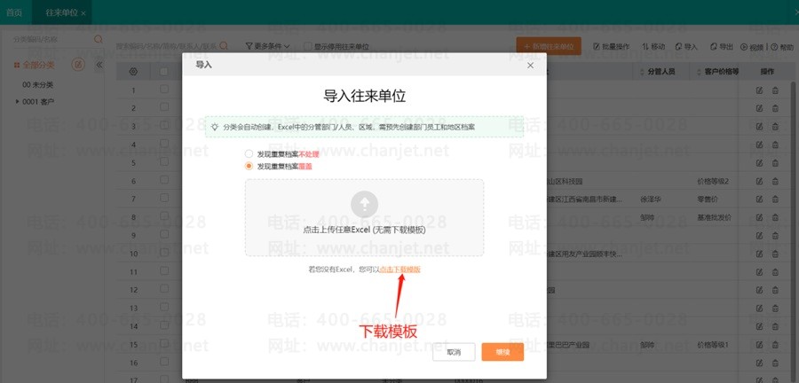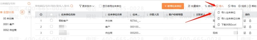 (7)往来单位批量导入:点击【基础信息】-【往来单位】-【导入】-【导入往来单位】-【点击下载模板】下载模板之后,整理数据到模板,再导入。
