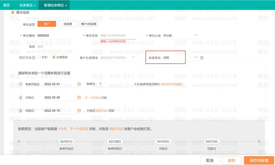 (4)收款信息:现结、月结、订金+发货前收款、订金+发货后尾款、订金+发货前中期款+尾款、不固定账期、限期收款(注:单位类型选择供应商是没有这个功能的)