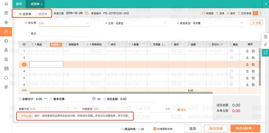 • 进货单:采购业务中最重要的一张单据,用来记录实际采购的信息,作为货物到库的依据,直接影响供应商的应付款和库存