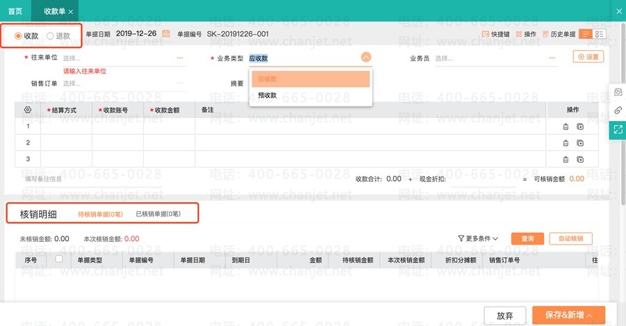 • 收款单: 收到往来单位的款项和退回给往来单位的款项, 单据类型包括收款单和退款单。业务类型包括应收款、预收款、直接收款