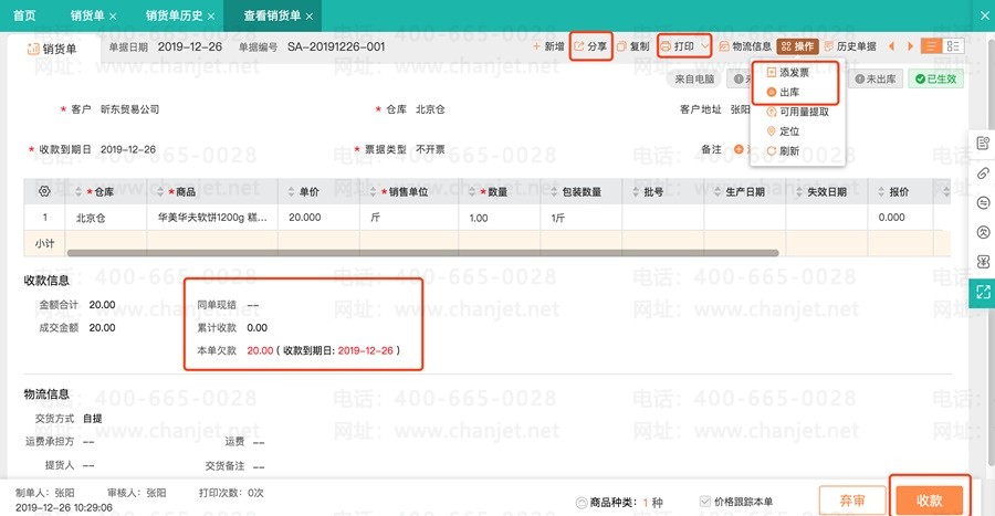 收款:开销货单时直接收款,也可以销货单保存后再收款