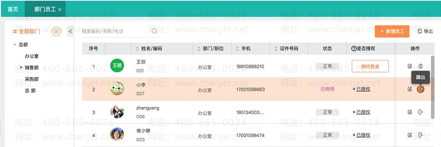 被踢出的员工,如果有登录账号此后将不能继续登录系统;
