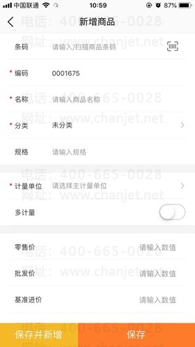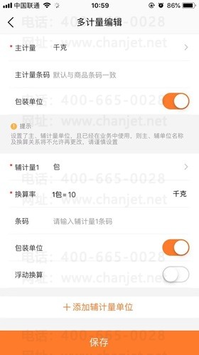 • 计量单位:支持多个计量单位,不同计量单位可以维护自己的条码