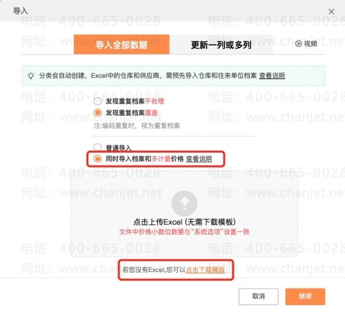 如果需要使用预置模板,可以直接在导入页面,点击【下载模板】进行下载。该预置模板和普通导入的预置模板在多计量及价格字段的预置上,有区别。