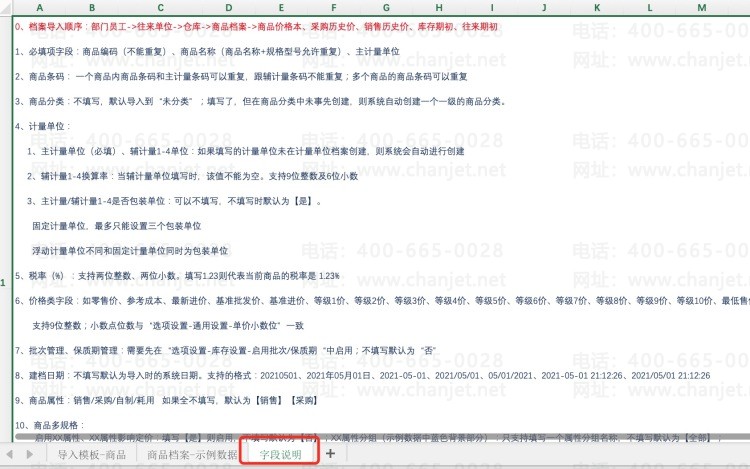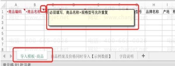在页签【导入模板-商品】中,点击字段上的红色小三角,可以查看各个字段的说明文案。