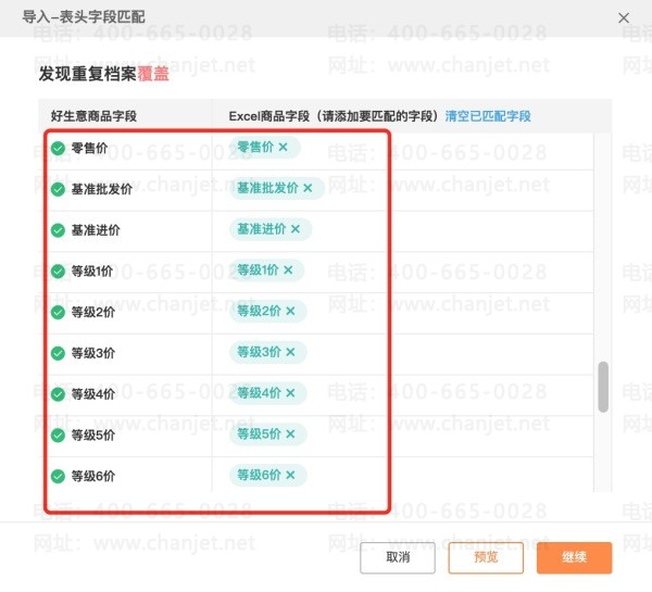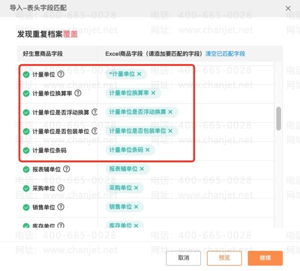导入时,我们直接将文件上传,将商品的计量单位对应在【计量单位】字段中,换算率对应在【计量单位换算率】,其他的计量单位及价格信息,也一一匹配即可。