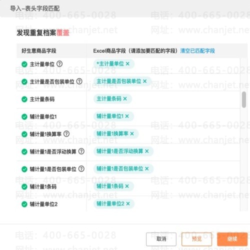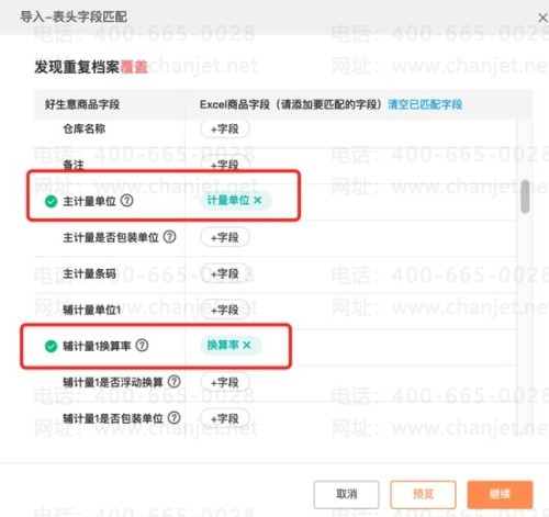 导入时,我们需要将【计量单位】与系统中的【主计量】进行匹配,将【计量单位换算率】与系统中【辅计量 1 换算率】进行匹配,如下图所求,即可。