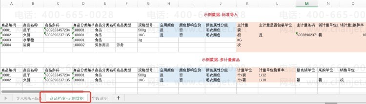 在页签【商品档案及价格同时导入【示例数据】】中,可查看详细的示例数据说明