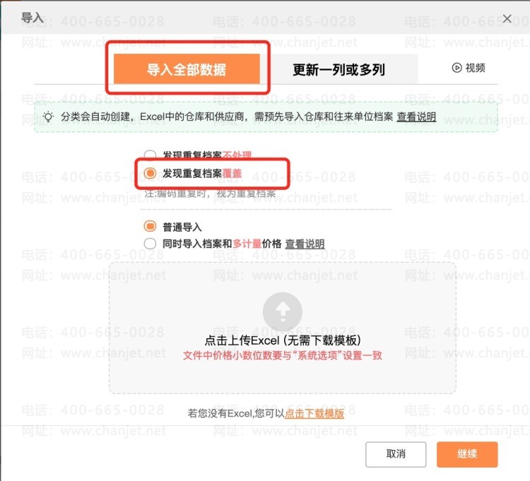注: 1、商品的计量单位不支持列更新,需要切换到【导入全部数据】页签,进行覆盖导入。
