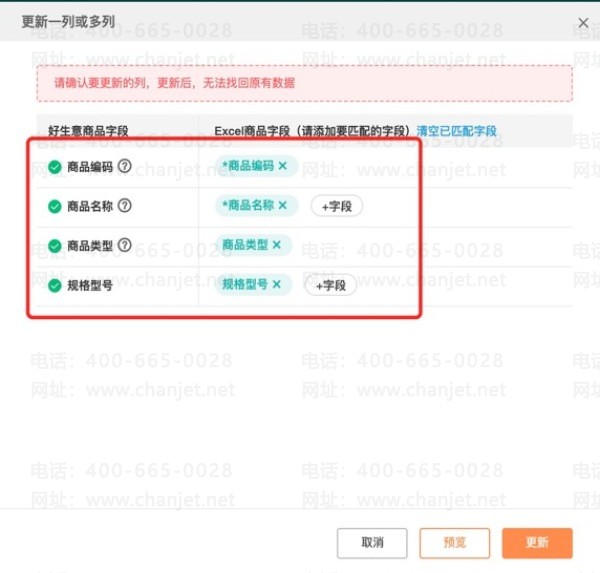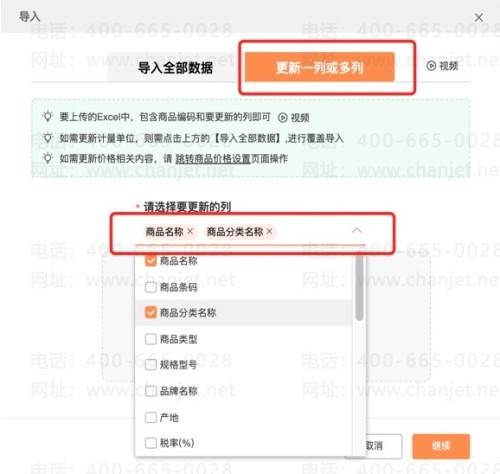 在页面【商品档案-导入-更新一列或多列】上选择需要更新的列。