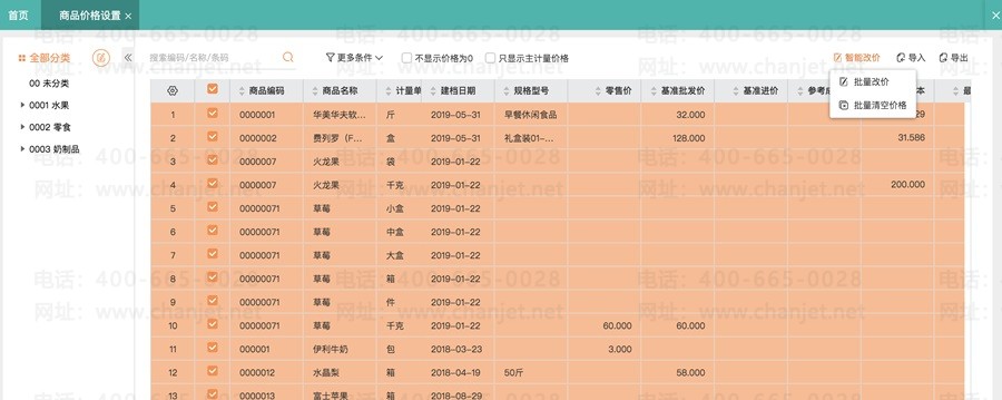 为某类商品定价,进入【营销】->【价格管理】->【商品价格设置】,选择一个分类,点击【智能改价】->批量改价,可以基于某个价格统一上浮或者降低百分之几: