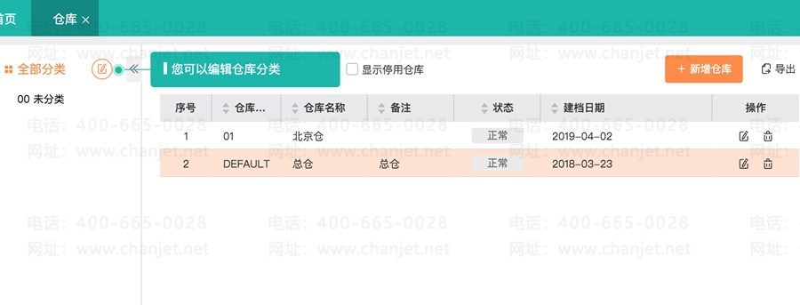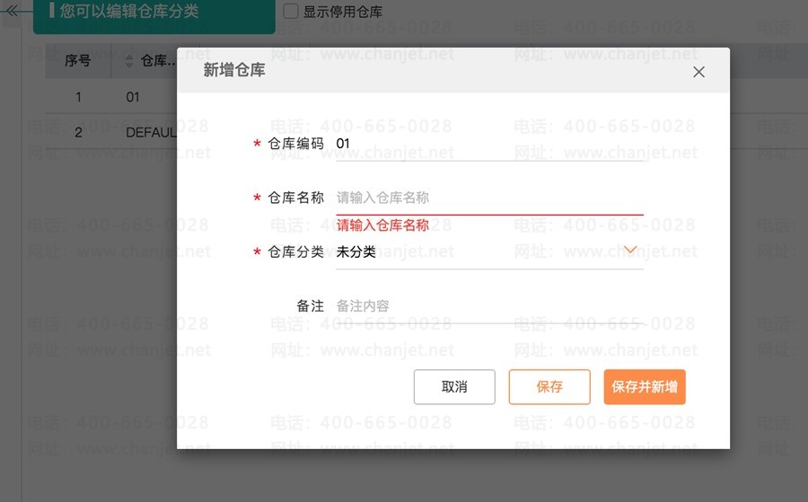 新增仓库:录入仓库编码、仓库名称、仓库分类、备注(选填)
