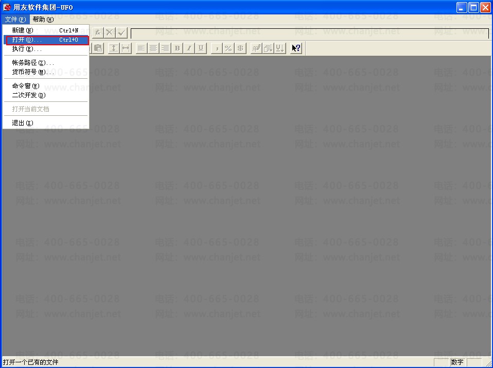 2、双击打开ufow.exe,点击“文件”菜单下的“打开”,选择C:\WINDOWS\system32\UFCOMSQL路径下的glpzje5.rep,点击打开;