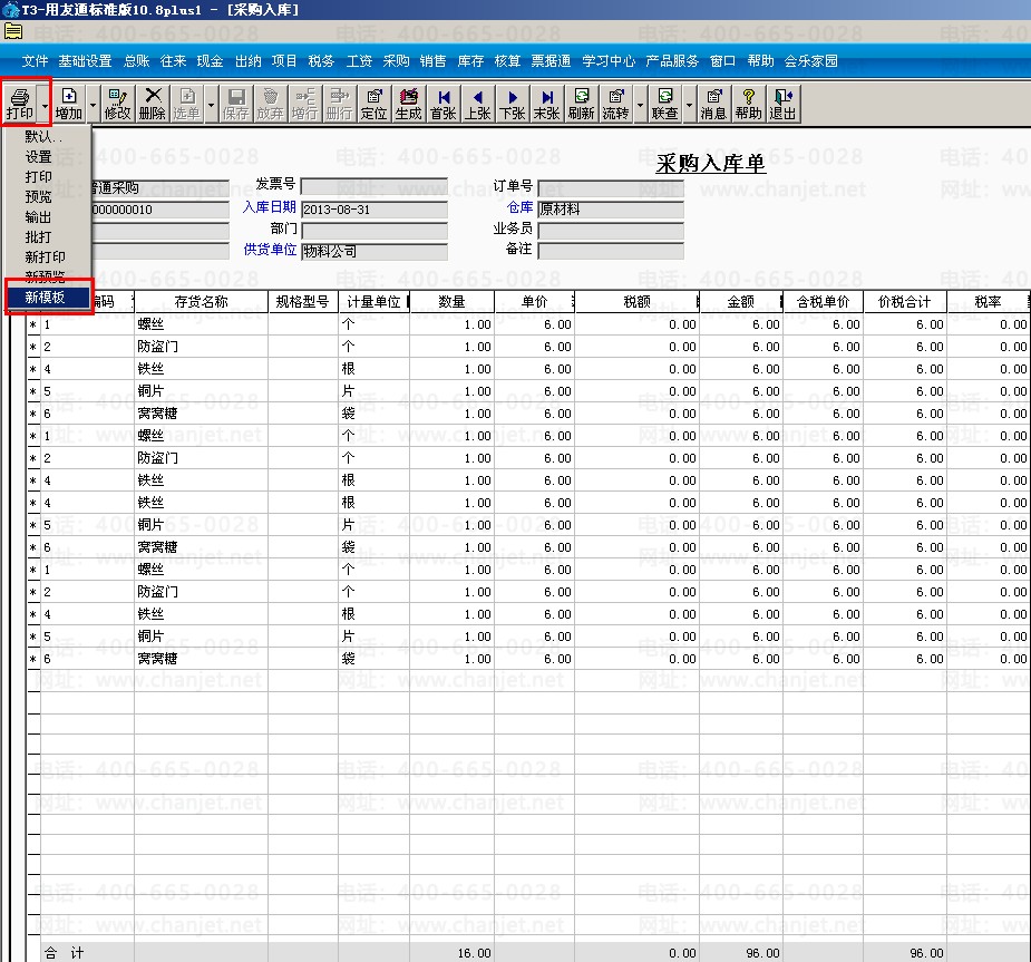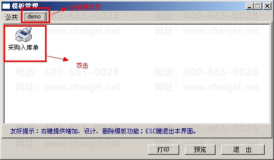 进入“采购管理”模块—点击“打印”—“新模板”,将“公共”下面“采购入库单”打印机一样的标志“复制”到“当前操作员”的下方,双击新模板,开始进行设置。