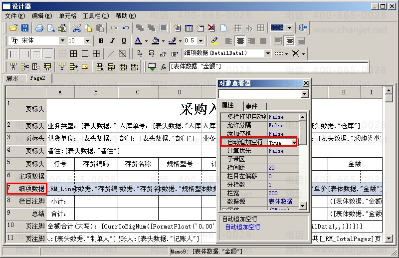 点击“细项数据”—“属性”—“每页记录数”修改为“5”,再到“自动追加空行”中将“false”修改为“true”.