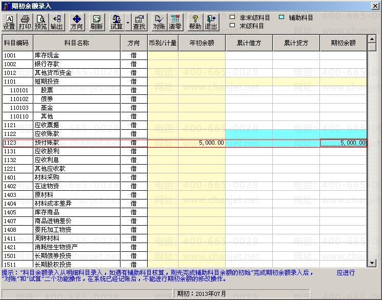 (1)点击“总账”—“设置”--“期初余额”,在预付账款和期初余额交叉列双击,点击“增加”,录入预付款5000元,选择供应商A