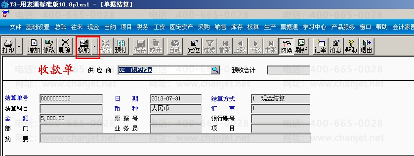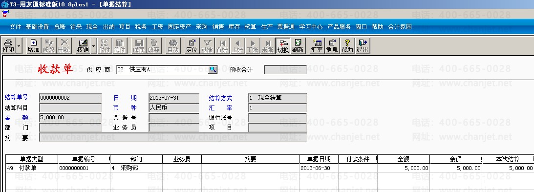 (3)打开采购管理模块,点击“收款结算”,在供应商选择供应商A,点击“切换”--“增加”,输入结算方式和金额,点击“保存”之后点击“核销”