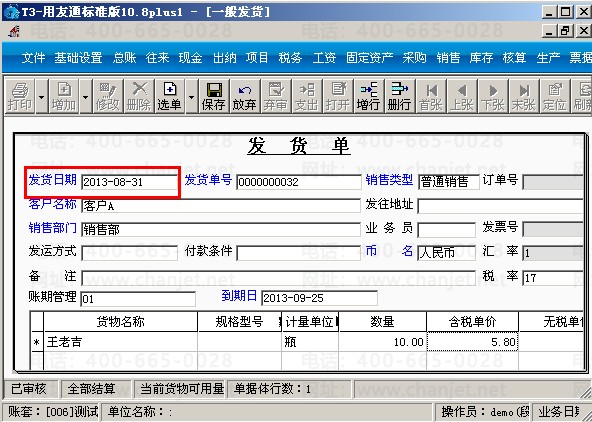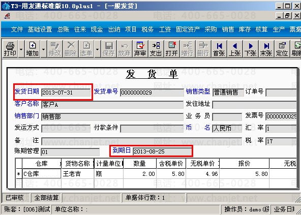 (4)在销售模块填制一张7月31号销售给客户A的发货单。