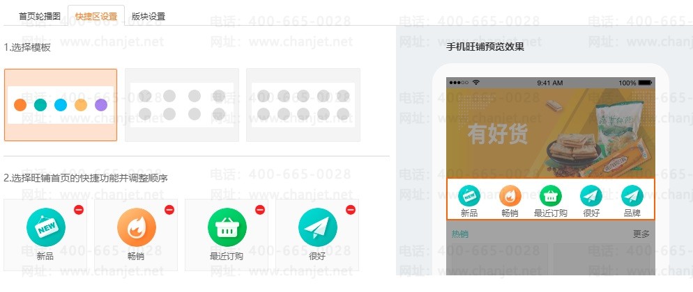 可以设置快捷区域在前台显示的模板,以及要显示的内容,包含三种模板供选择,并且内置了丰富的快捷板块:畅销、新品、常买、我的收藏、最近订购、我的足迹,并且在配置过程中,可以预览效果,并且支持自定义快捷区域,包含快捷模块的名称、顺序、跳转页面,支持支持四种跳转方式设置:商品分类、商品标签、商品品牌、某些商品。