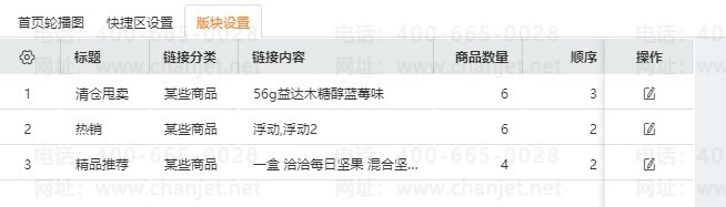 企业可以自定义首页板块区域,包含三个板块区域,可以自定义标题、链接分类,支持支持四种跳转方式设置:商品分类、商品标签、商品品牌、某些商品。