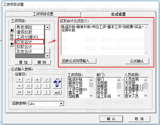 3.返回【公式设置】页签,查看【应发合计公式定义】,【高温补贴】工资项目自动被删除,同理,新增工资项目需要设置为【应发合计】公式,将其工资项目定义为【增项】即可。