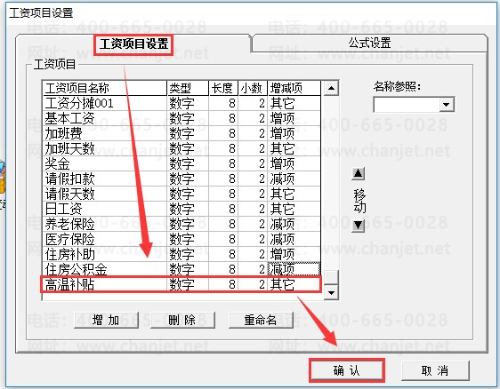 2.如需在公式设置中删除【高温补贴】项目,选中【工资项目设置】页签,找到【高温补贴】工资项目,将其【增减项】由【增项】修改为【其它】后,点击【确认】即可。