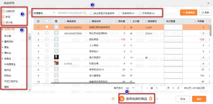 2.在商品参照弹框中,可以通过多种条件查找商品,如图中①提供的搜索、库存条件,图中②提供的类目,图中③提供的近期购买、新品、频次高等数据分析,多个条件选择的商品,均会保存在图中④“连续选择的商品”中,点击保存即可将商品同步至旺铺。