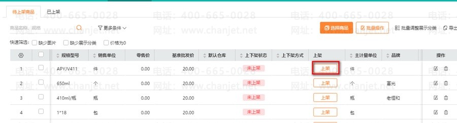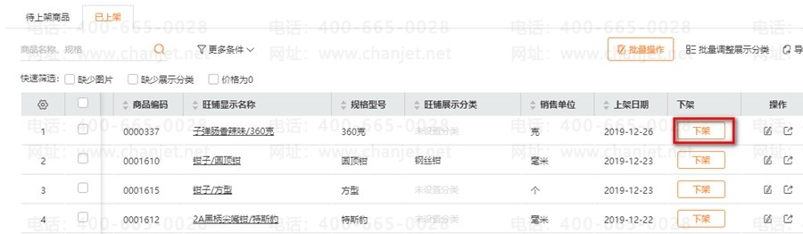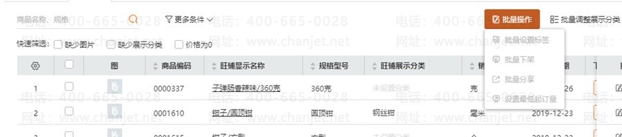 场景三:批量修改商品标签、起订量、展示分类、上架商品、删除商品等。