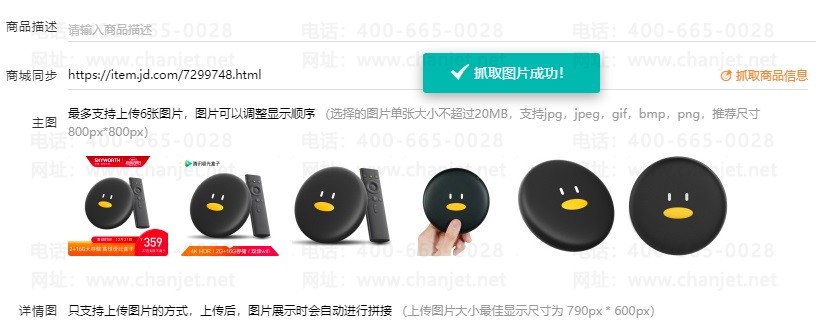 2.在商品编辑页,可以录入京东、1688的商品链接,系统自动抓取商品主图及商品详情图;